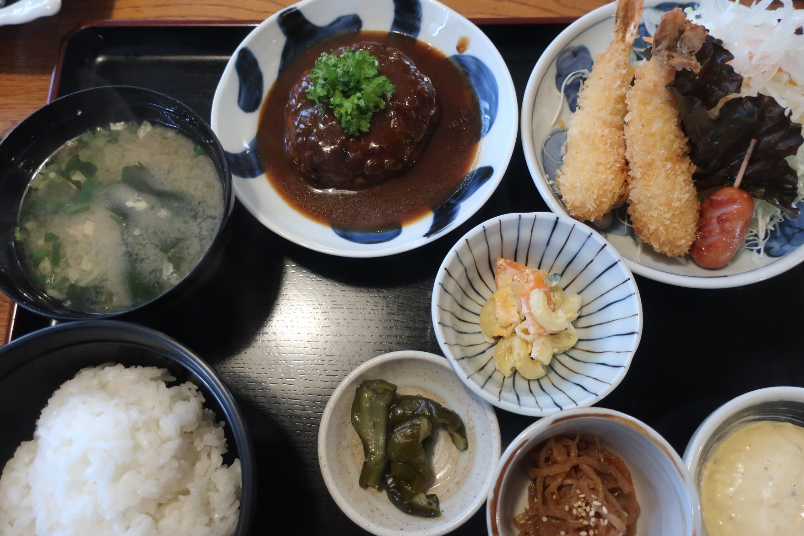 僕はハンバーグとエビフライの定食を選び、角煮の単品を友人とシェア。