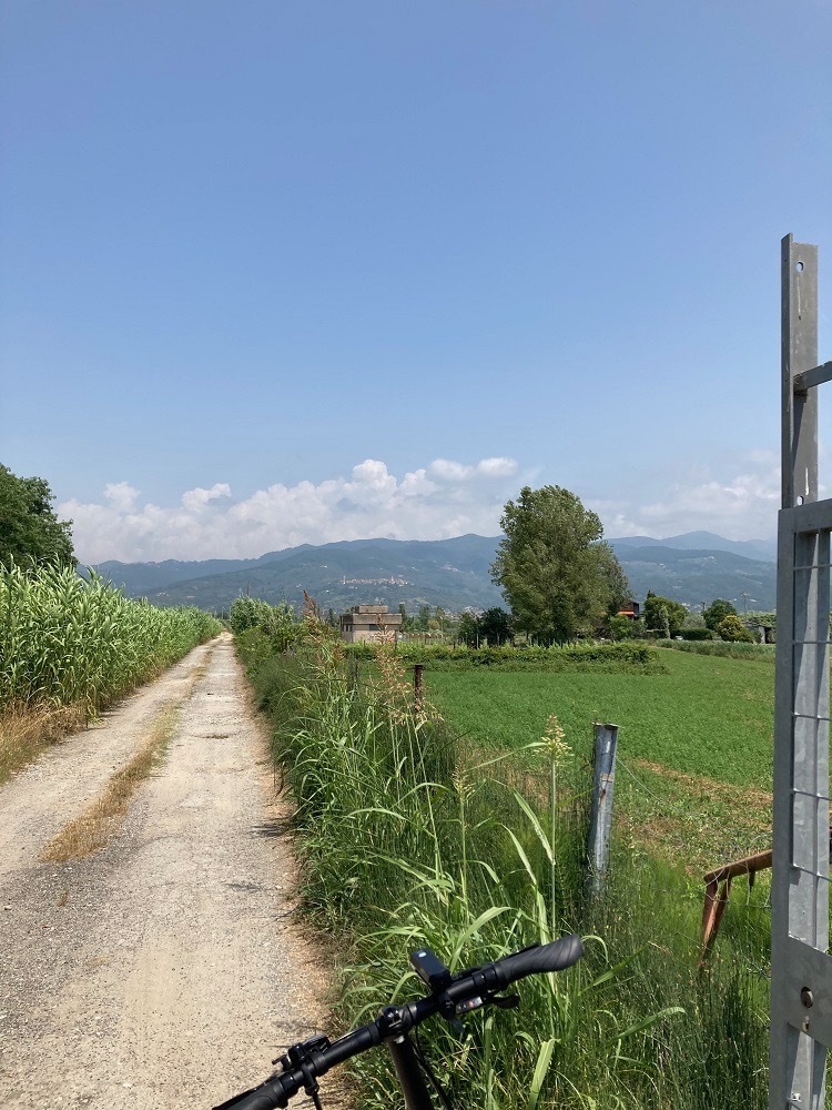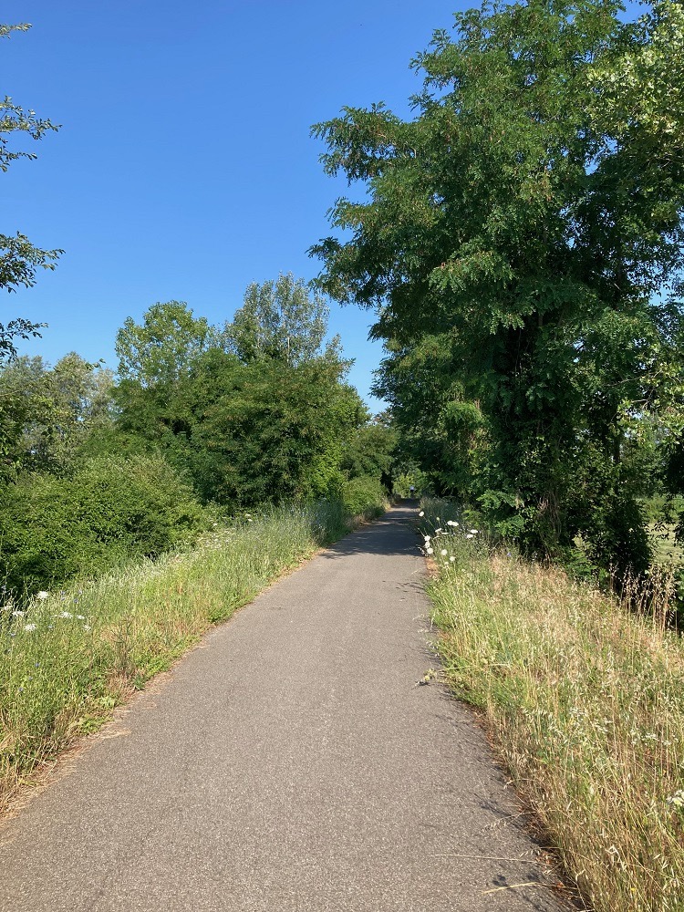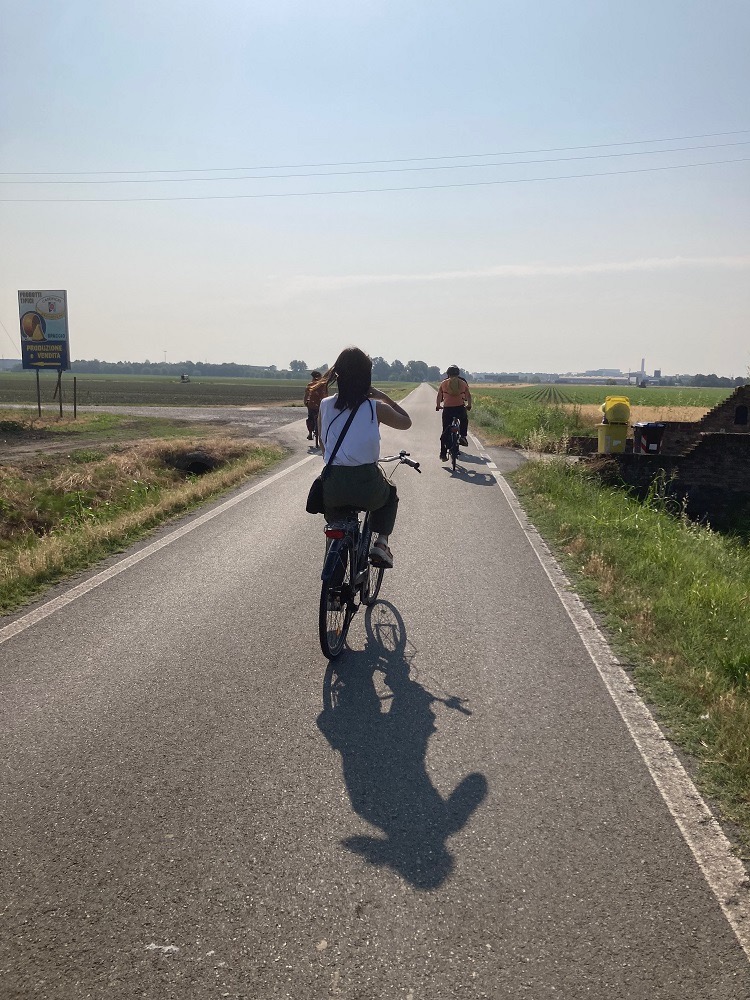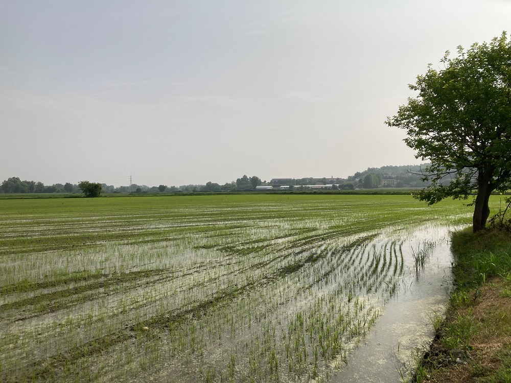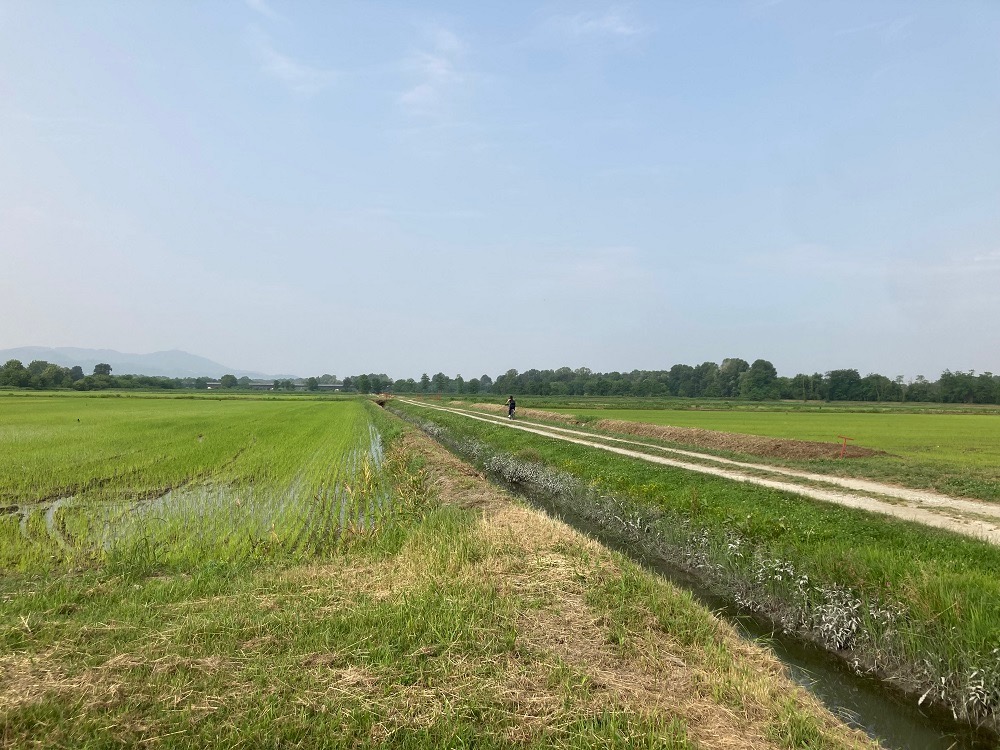 イタリアの田んぼを見たくて、トリノから電車で20分ほどの小さな町へ行きました。ポー川沿いにミラノまで米どころが続く一帯です。ホテルから自転車で30分近くかかる場所でしたが、ゆるやかな地形の舗装道で交通量も少なく、サイクリストも何人も見かけました。