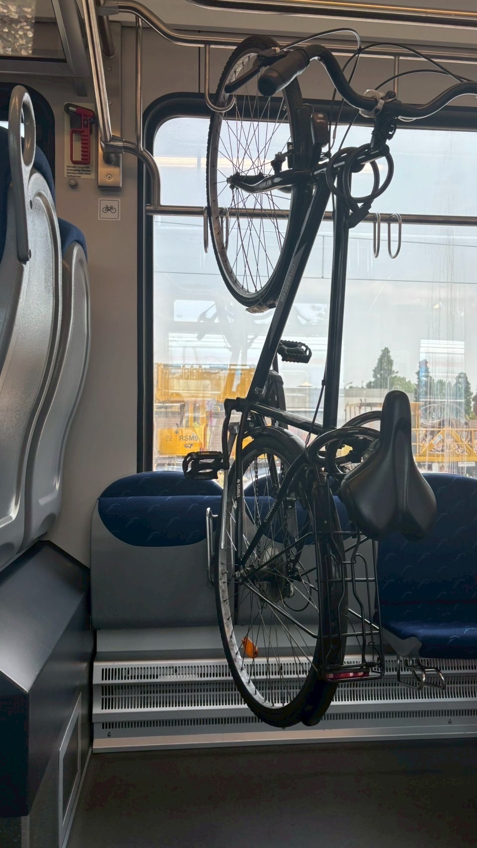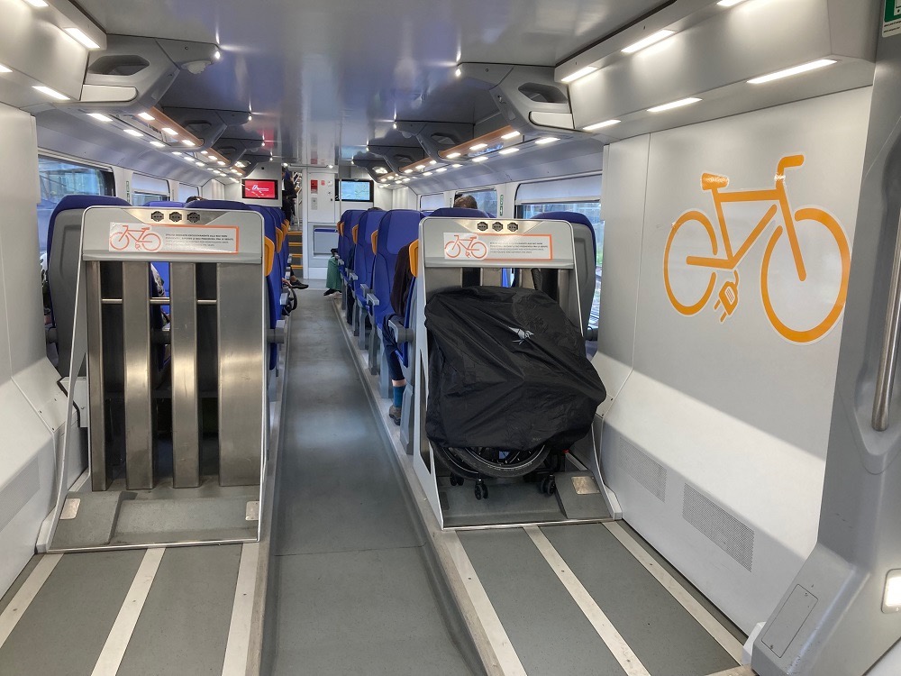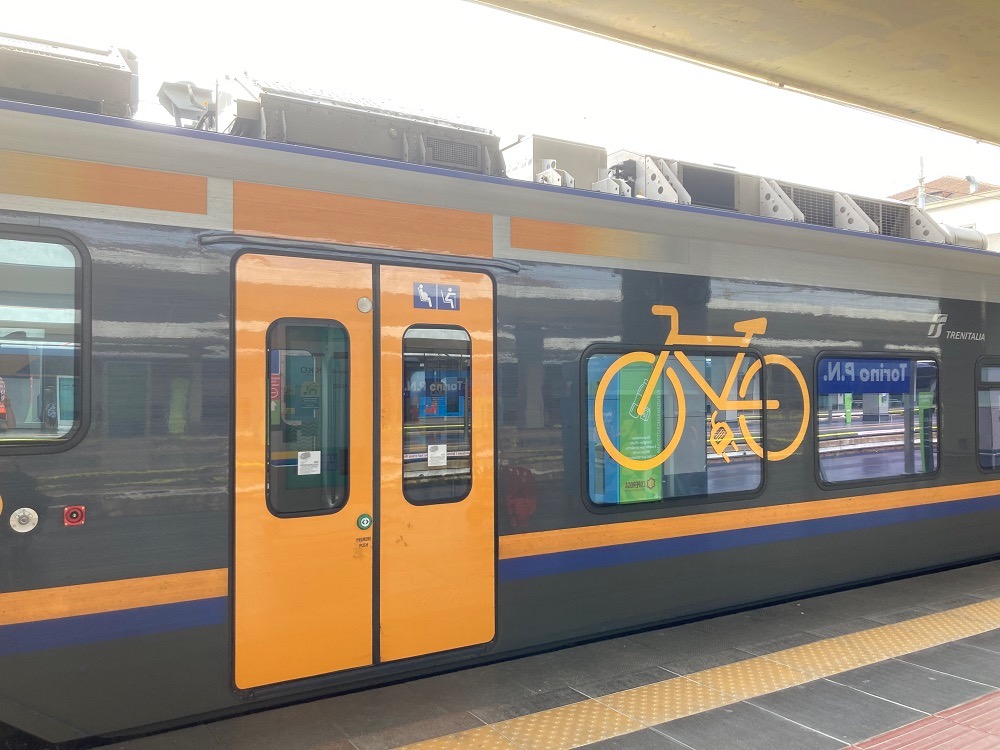 イタリアの電車の9割ほどで、自転車用車両マークはこのEバイクマークに変わっていました。車両内の自転車置き場にもコンセントがあります。フランスやスイスと比較してのEバイクの普及率とは関係なさそう(むしろイタリアはEバイク率いちばん低そう)