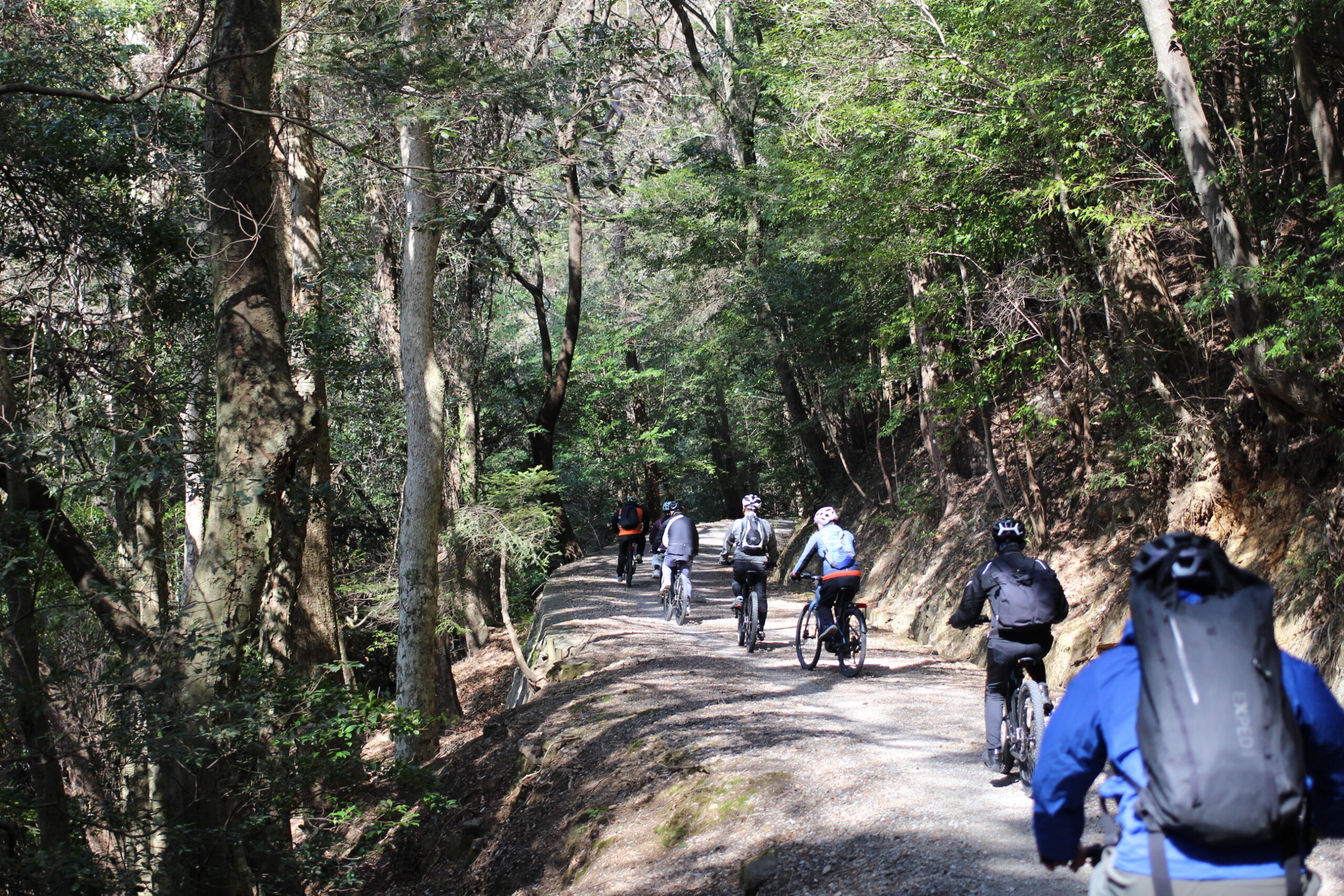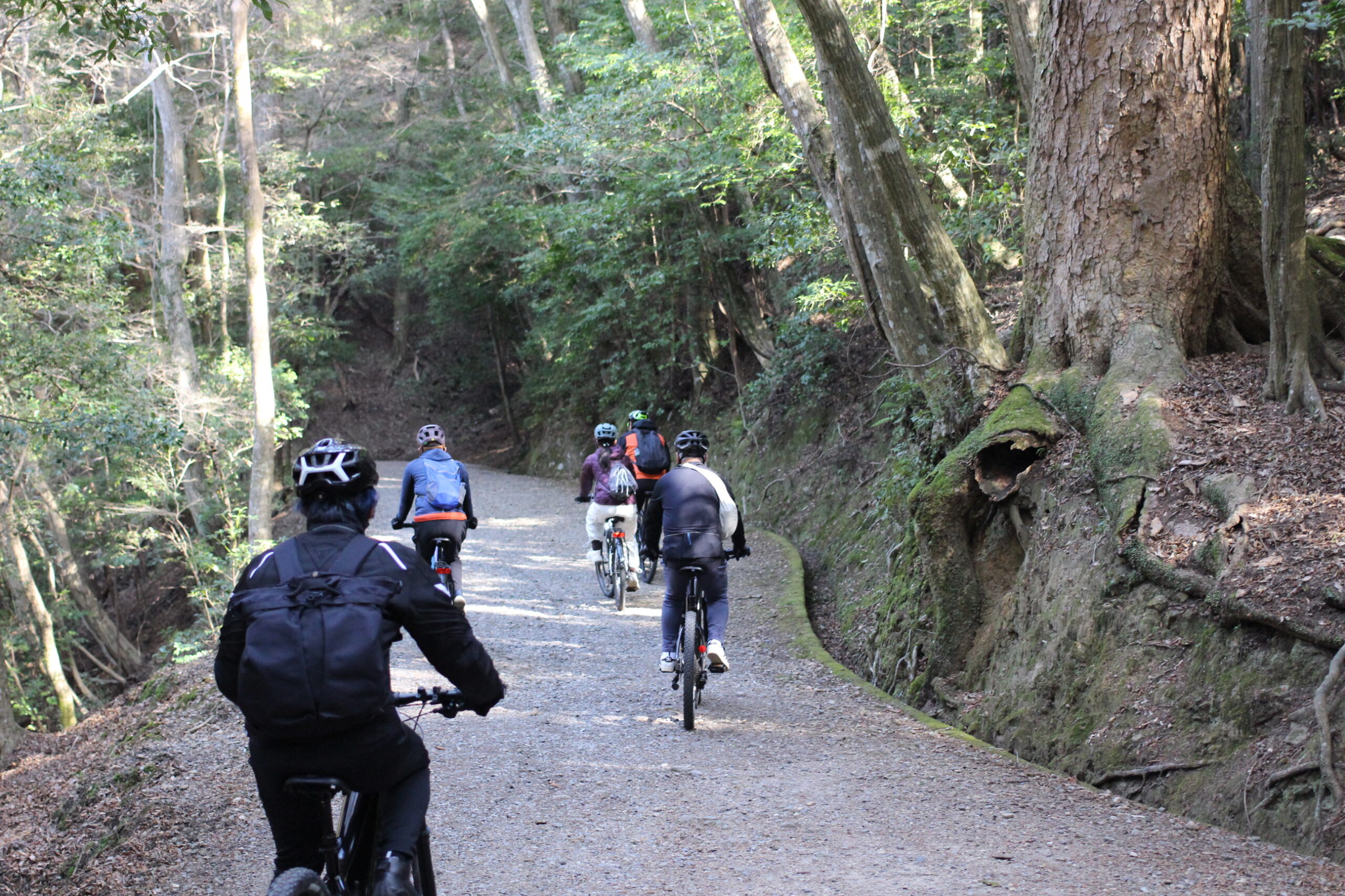 春日山原始林の中はとても静か。しかし平均8%程の勾配があるため非電動アシストの自転車で登るのはとっても大変!